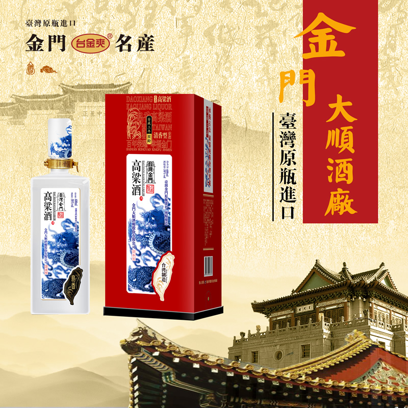 金門大順酒廠,座落于金門北緯24.5度,地處海隅,濱大陸,得天獨厚的地理,使它擁有絕佳的水質、空氣、氣候及原料的四大天然釀酒條件。金門大順酒廠的高粱酒釀造是利用金門特產『旱地高粱』、引用當地水質甘甜的泉水、金門潔凈的空氣與氣候條件,并承襲傳統古法之釀酒技術,加上獨家的釀酒專業技術經驗【三離二鍋一翻】的發酵釀酒工藝,經掐頭去尾后入庫,去蕪存菁。而造就出金門大順酒廠的高粱酒特色「清澈透明、質地純凈、芳香濃郁」之一系列高粱酒。金門大順酒廠制酒承襲著金門得天獨厚的地理環境,加上三代流傳之古法醇釀技技術,結合經驗與現代化生產,釀出風味獨特,香、醇、甘、冽的【臺島】【臺金爽】【牛樟芝高粱酒】【龍騰鳳舞】【紅雙十】【陳高吶】【臺灣小酒】等多樣系列產品。真實原味、清香散發,甘冽醇厚的絕佳風味。